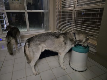 Poor Sassy has a "Mega-esophagus" and our vet has not seen one has bad/big as hers. "It should not be visible on an x-ray". Her's and Akula's food and water bowls are now up on 5 gallon paint buckets and the condition has greatly improved BUT...